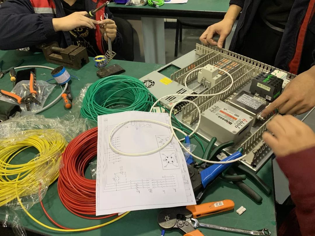 針對不同伺服電機功率的大小,生產人員選擇相應線徑的線纜和制作工藝。了解電氣設計工程師提供的客戶現場的情況,選擇線纜的長度,確認機架與電控柜線纜之間的連接方式,根據圖紙進行接線、焊線等工作,焊線時,焊點要平滑,不要焊連,保證相應點位焊接牢固,必要的地方要套上熱縮管,打上熱熔膠,防止點位之間短路或銅絲,屏蔽線外露,線纜脫落,以達到保護焊點,保證設備安全運行,焊接完成后,還要檢測線纜是否焊牢,相序是否正確,同時要用標簽紙區分電機線纜軸號和連接位置。